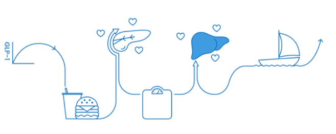 用GLP-1受體激動劑治療2型糖尿病患者可以使其胰島素分泌增加、胰島素抵抗降低、血糖降低以及體重減輕。